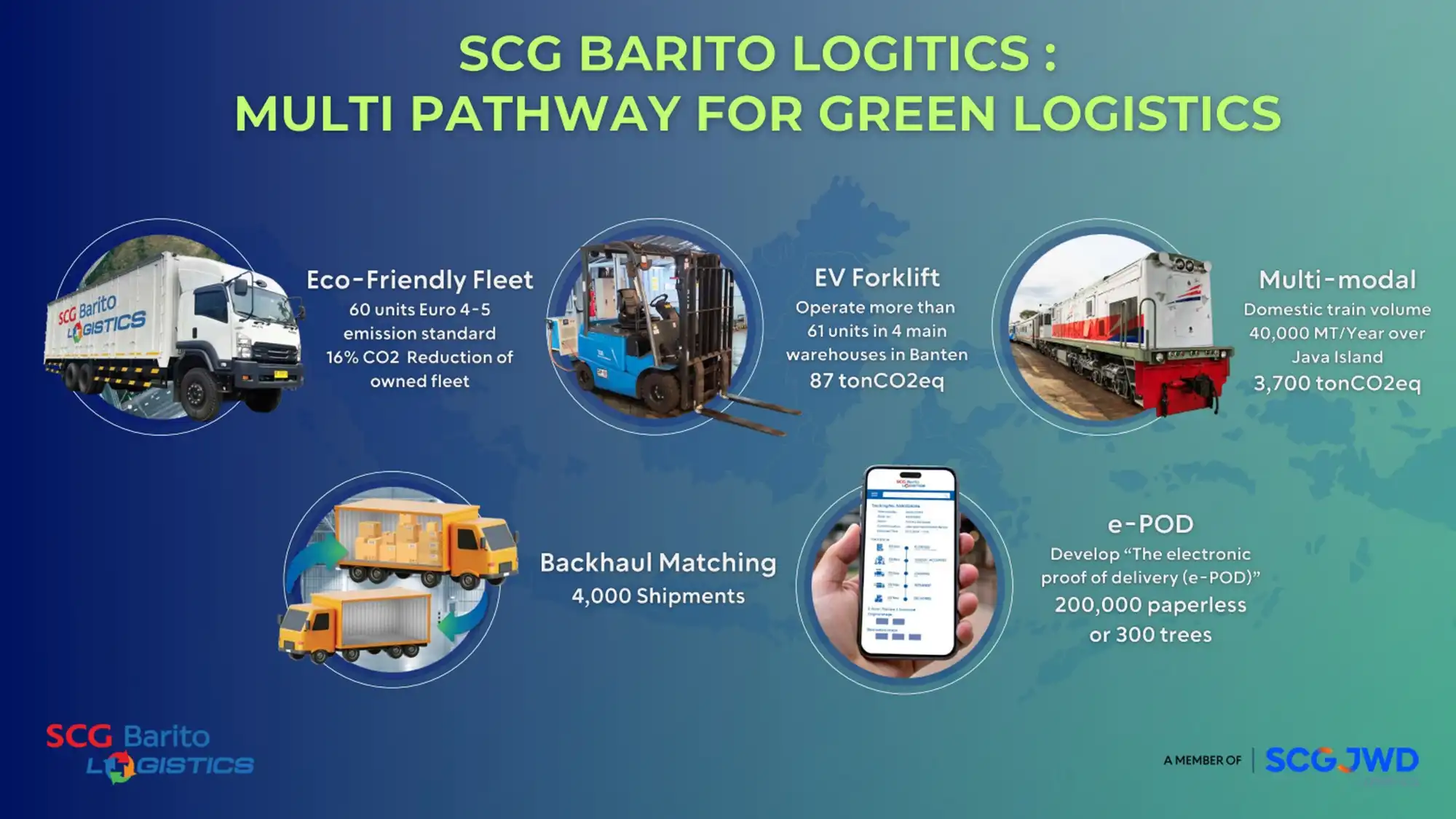 To fulfil its commitment to reduce emission in Indonesia’s logistics industry, SCG Barito Logistics and SCGJWD has initiated a series of concrete steps to build an environmentally friendly logistics system. These initiatives encompass a range of strategic approaches, including: