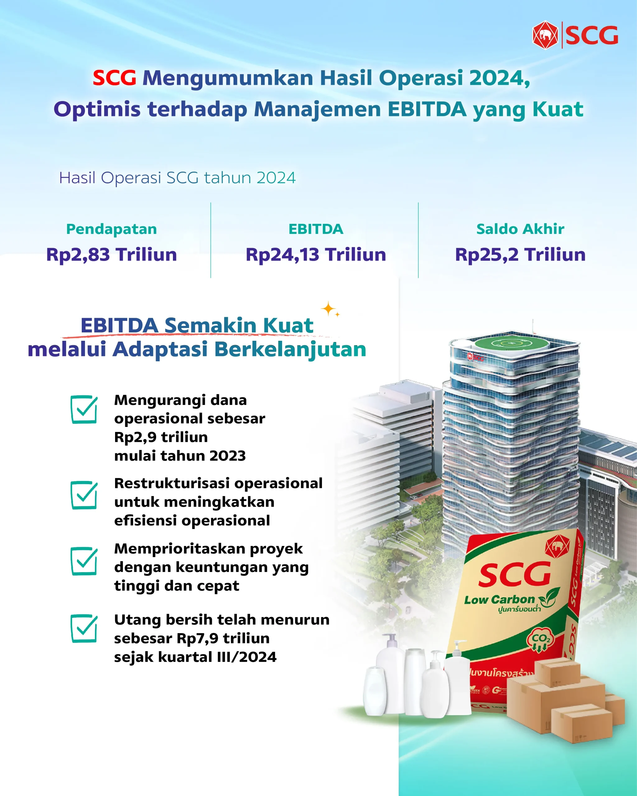 Jakarta, 7 Februari 2025 – SCG, selaku pemimpin bisnis regional, mencatat nilai Earnings Before Interest, Taxes, Depreciation, and Amortization atau EBITDA sebesar Rp24,13 triliun (1.528 juta USD), didorong oleh pengelolaan biaya yang ketat, percepatan pengiriman High-Value Added Products & Services (HVA), serta pengurangan modal kerja secara berkelanjutan, investasi pada proyek-proyek dengan imbal hasil tinggi dan cepat, ditambah dengan utang yang mengalami penurunan dibandingkan dengan kuartal sebelumnya. Yakin dengan kesehatan keuangan yang kuat, SCG berada dalam posisi yang strategis untuk mengoptimalkan peluang dari pemulihan ekonomi regional di tahun 2025.